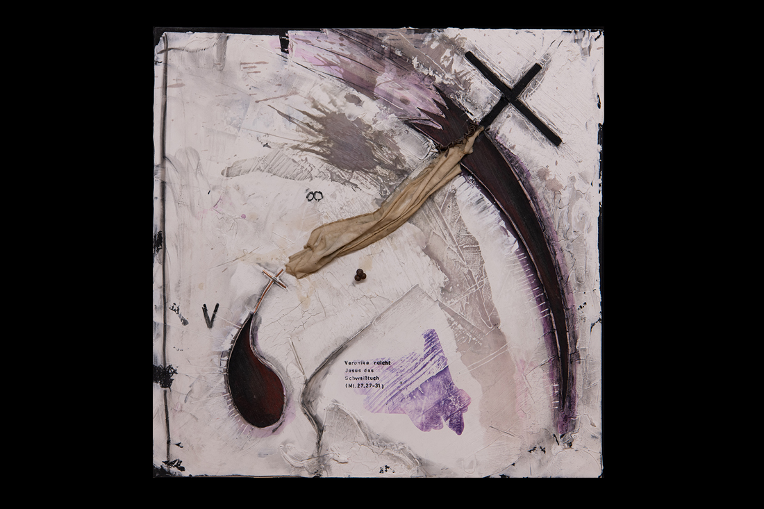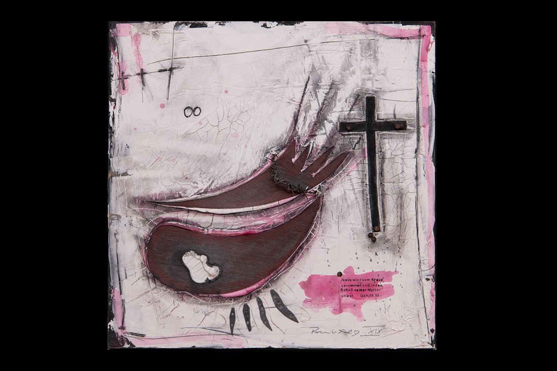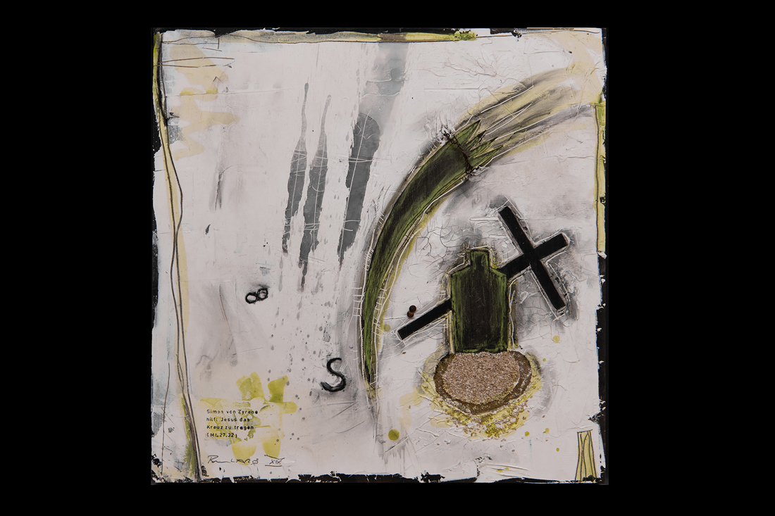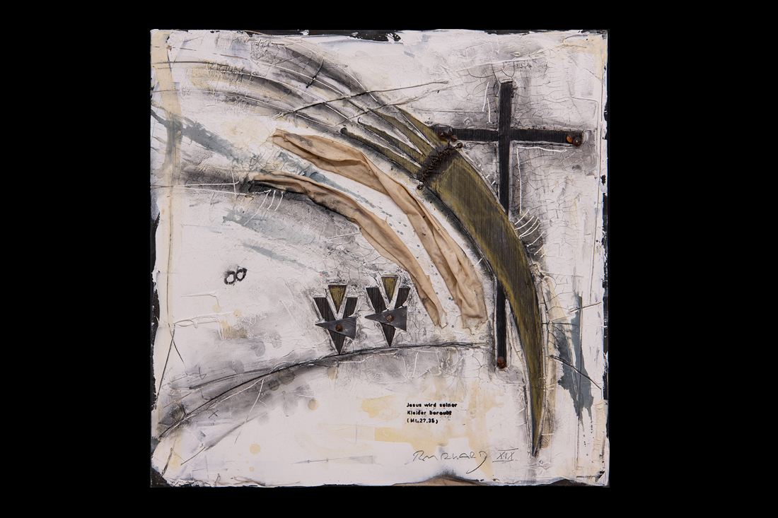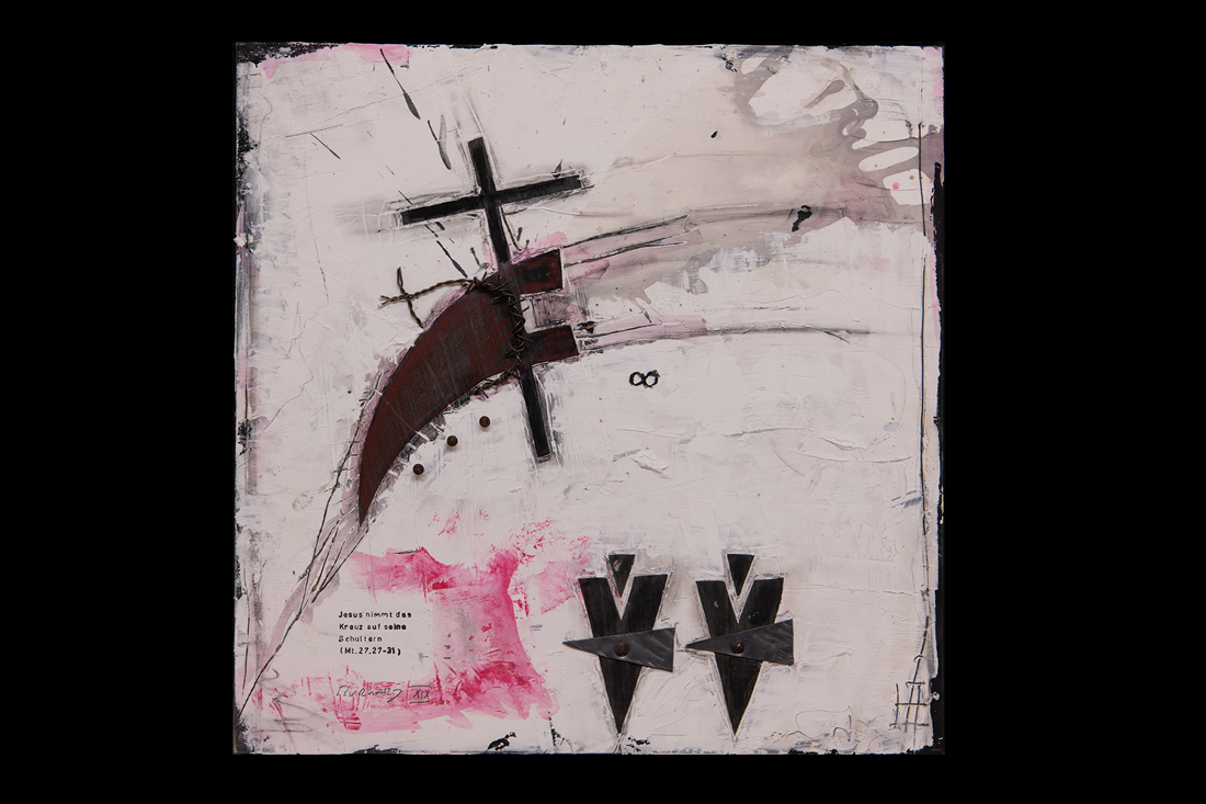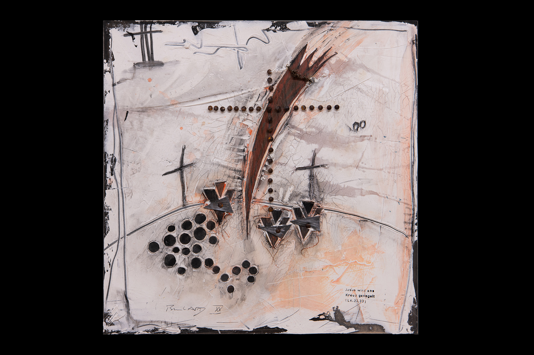 Im Jahre 2019 entstand in einer einjährigen Arbeit der 14-teilige Kreuzweg für den sakralen Raum. Wir finden diese Kreuzwege in katholischen Kirchen und auch für meine Arbeit eines traditionellen Themas in moderner Abstraktion suche ich im Ankauf noch einen entsprechenden Raum. Die einzelnen Stationen sind im Maß je 50x50cm im weißen Holz-Schattenfuge-Rahmen.