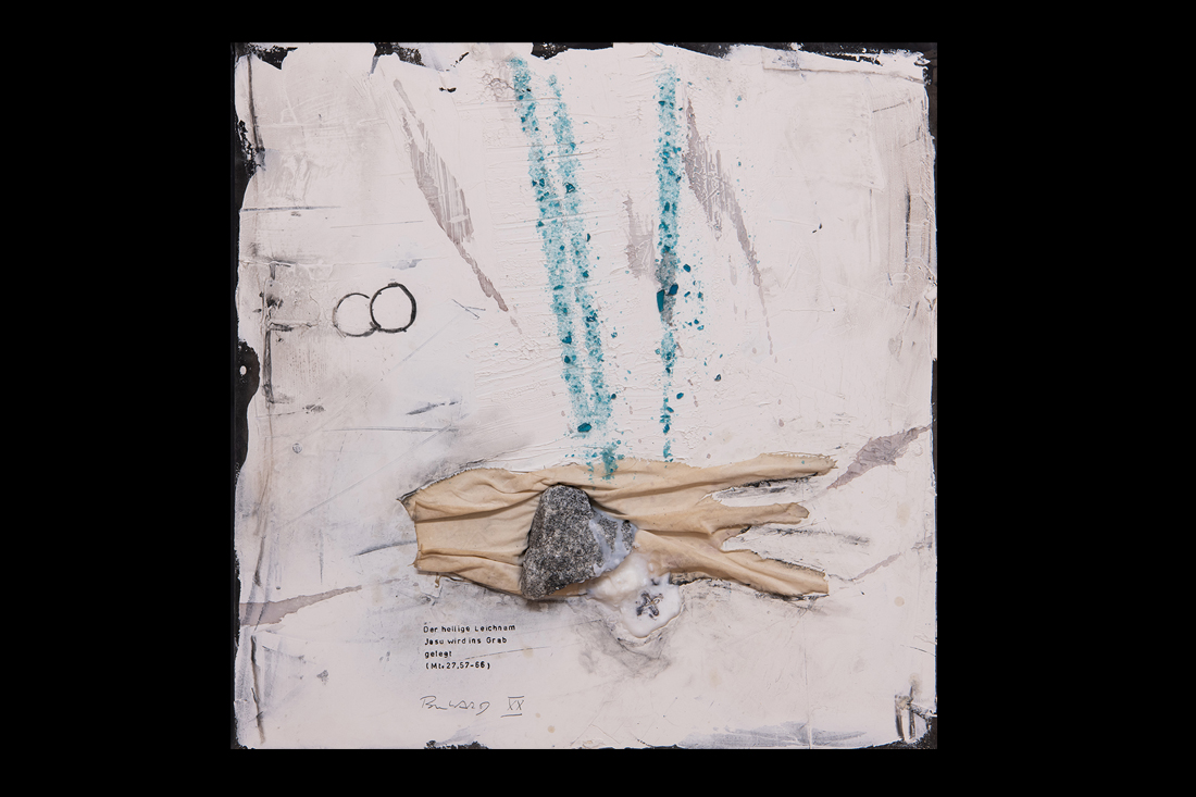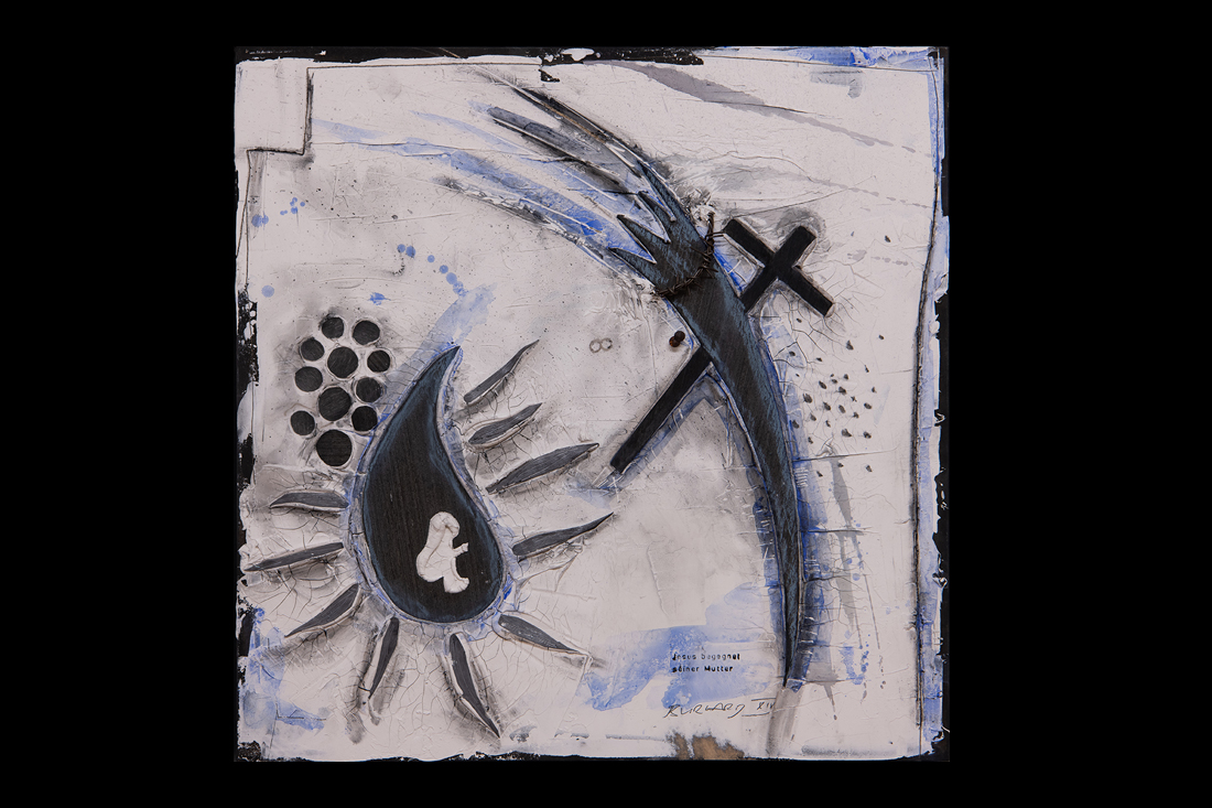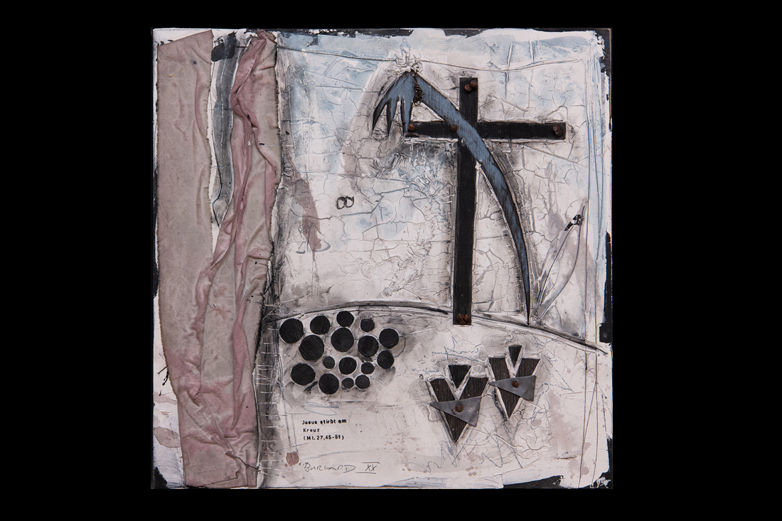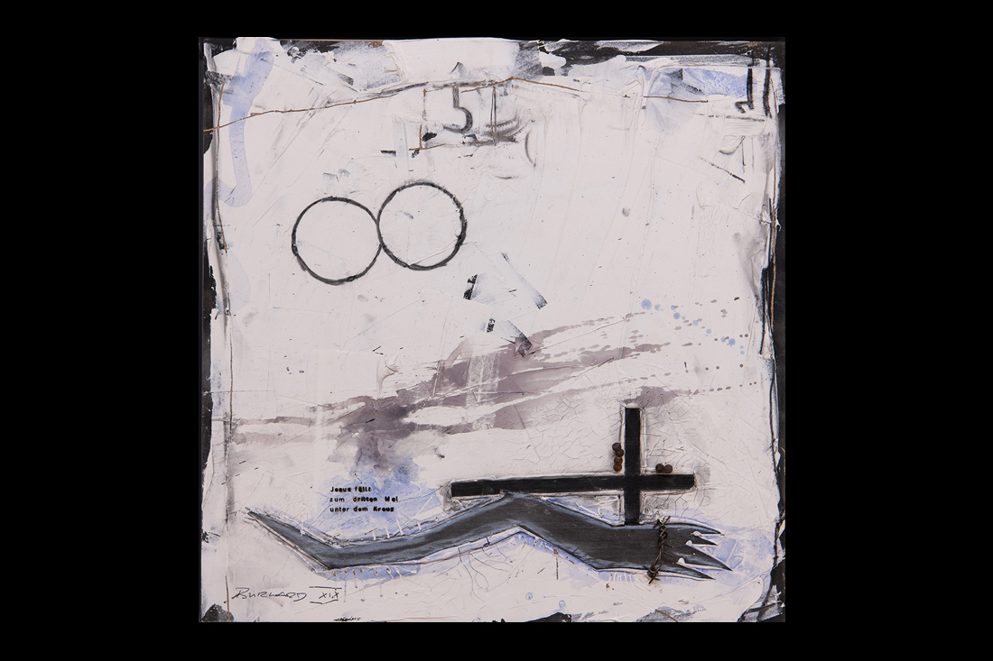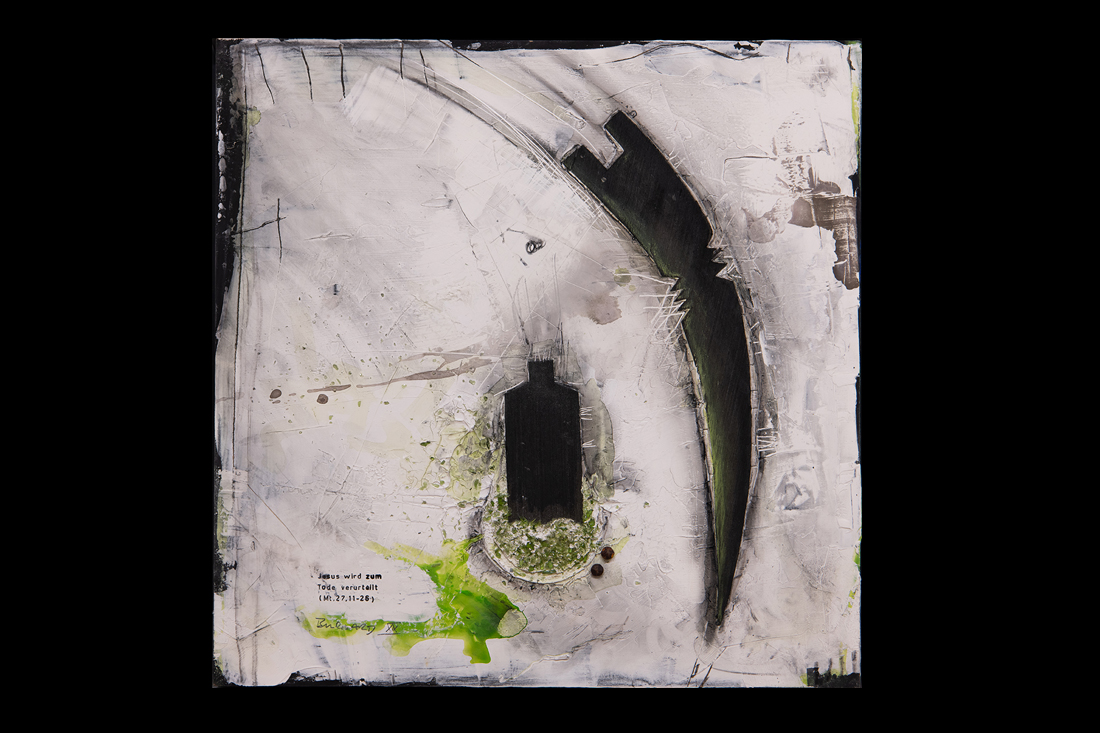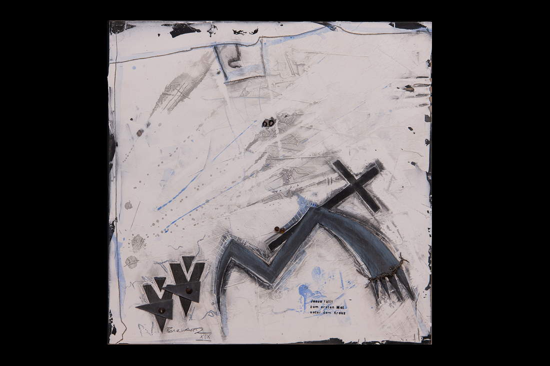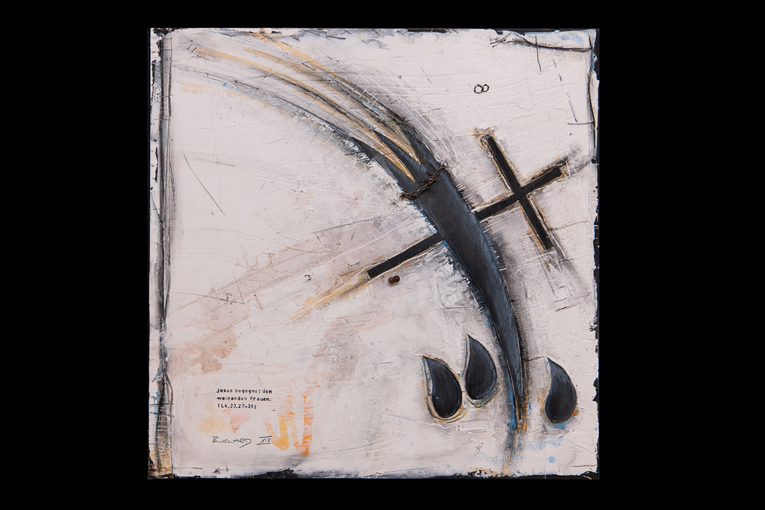 Im Jahre 2019 entstand in einer einjährigen Arbeit der 14-teilige Kreuzweg für den sakralen Raum. Wir finden diese Kreuzwege in katholischen Kirchen und auch für meine Arbeit eines traditionellen Themas in moderner Abstraktion suche ich im Ankauf noch einen entsprechenden Raum. Die einzelnen Stationen sind im Maß je 50x50cm im weißen Holz-Schattenfuge-Rahmen.